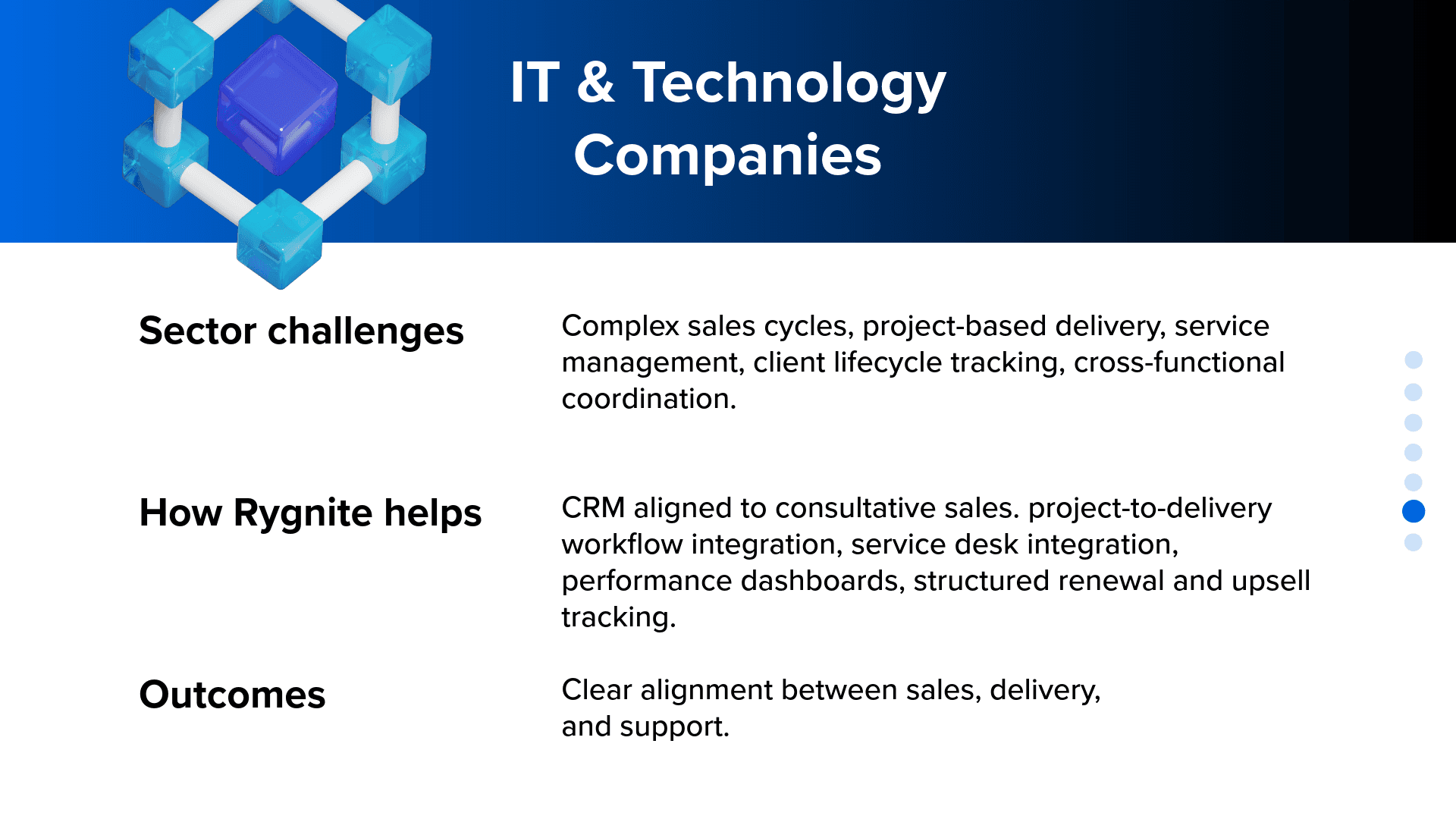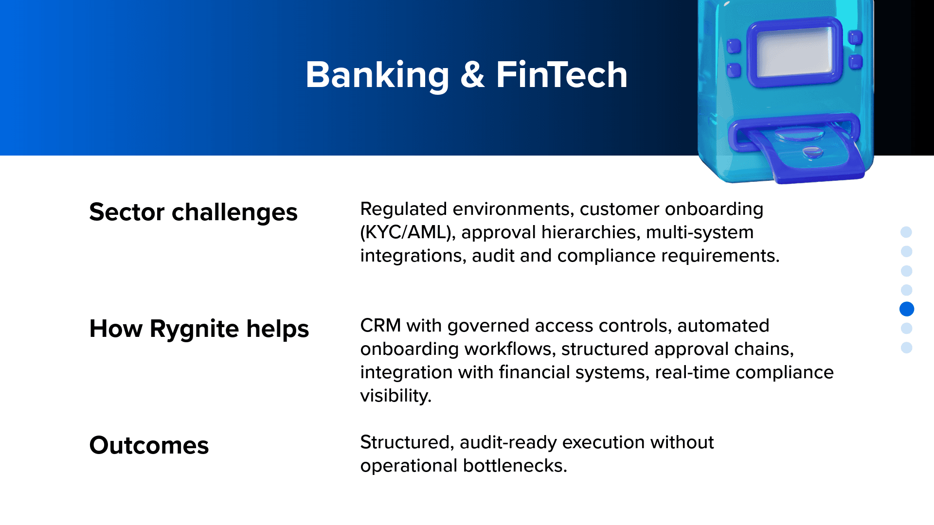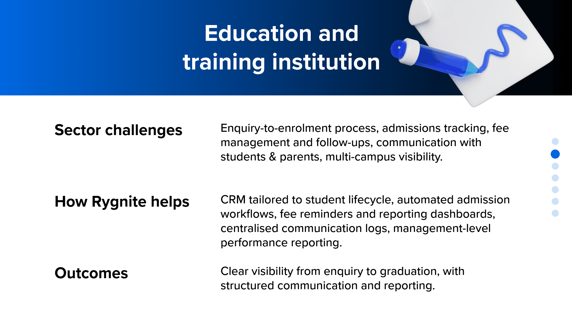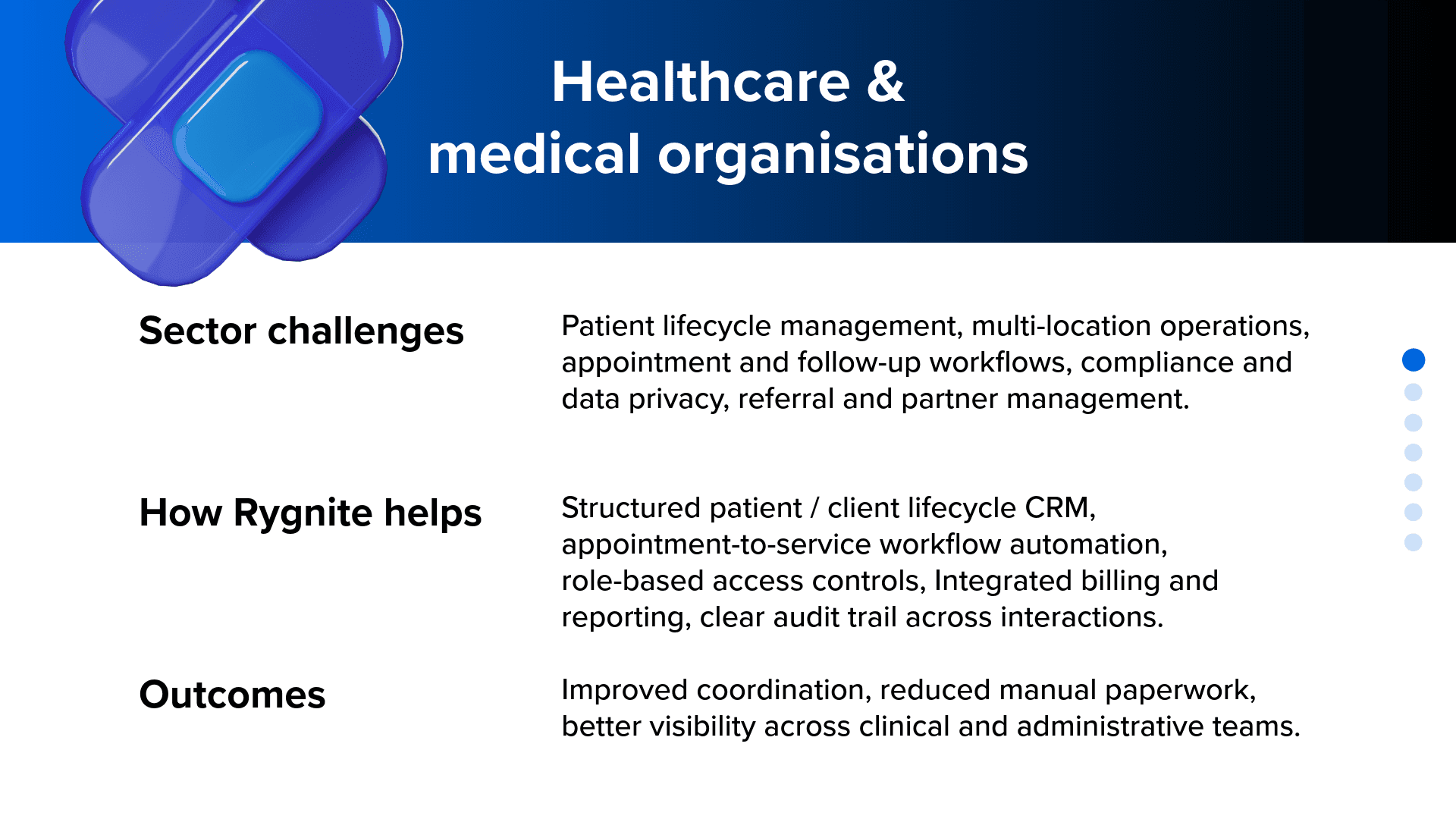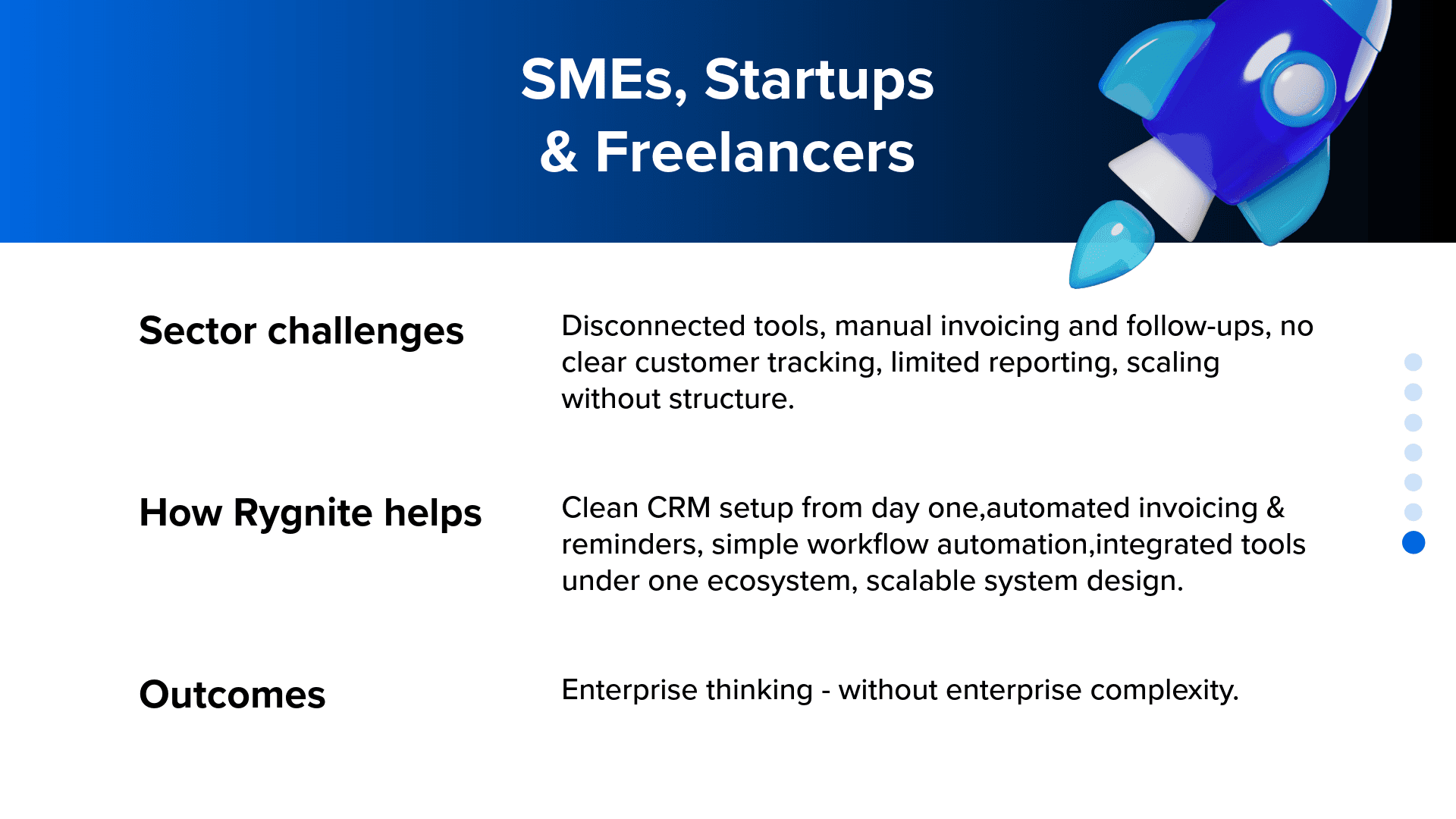 Every sector runs differently. Customer journeys differ. Compliance differs. Operational complexity differs. Rygnite adapts Zoho CRM and related applications to match how your sector actually operates, not just how software is configured.